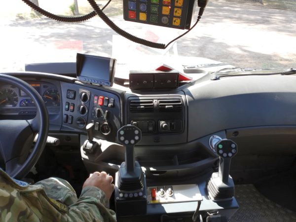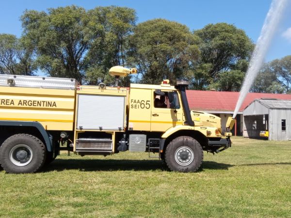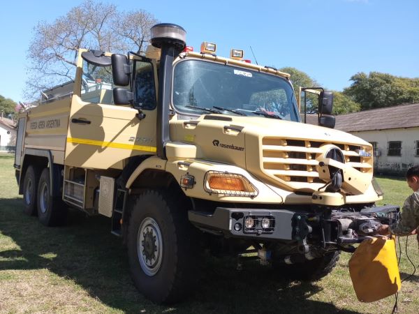 El autobomba es un Mercedes Benz Zetros con carrozado Rosembauer de tracción 6x6 con tanque con agua y posibilidad de generar espuma, posee dos cañones monitores que se operan desde la cabina de conducción, estos camiones tienen medidas específicas que le permiten ser transporatos por los aviones Hércules C130 de la Fuerza aérea.